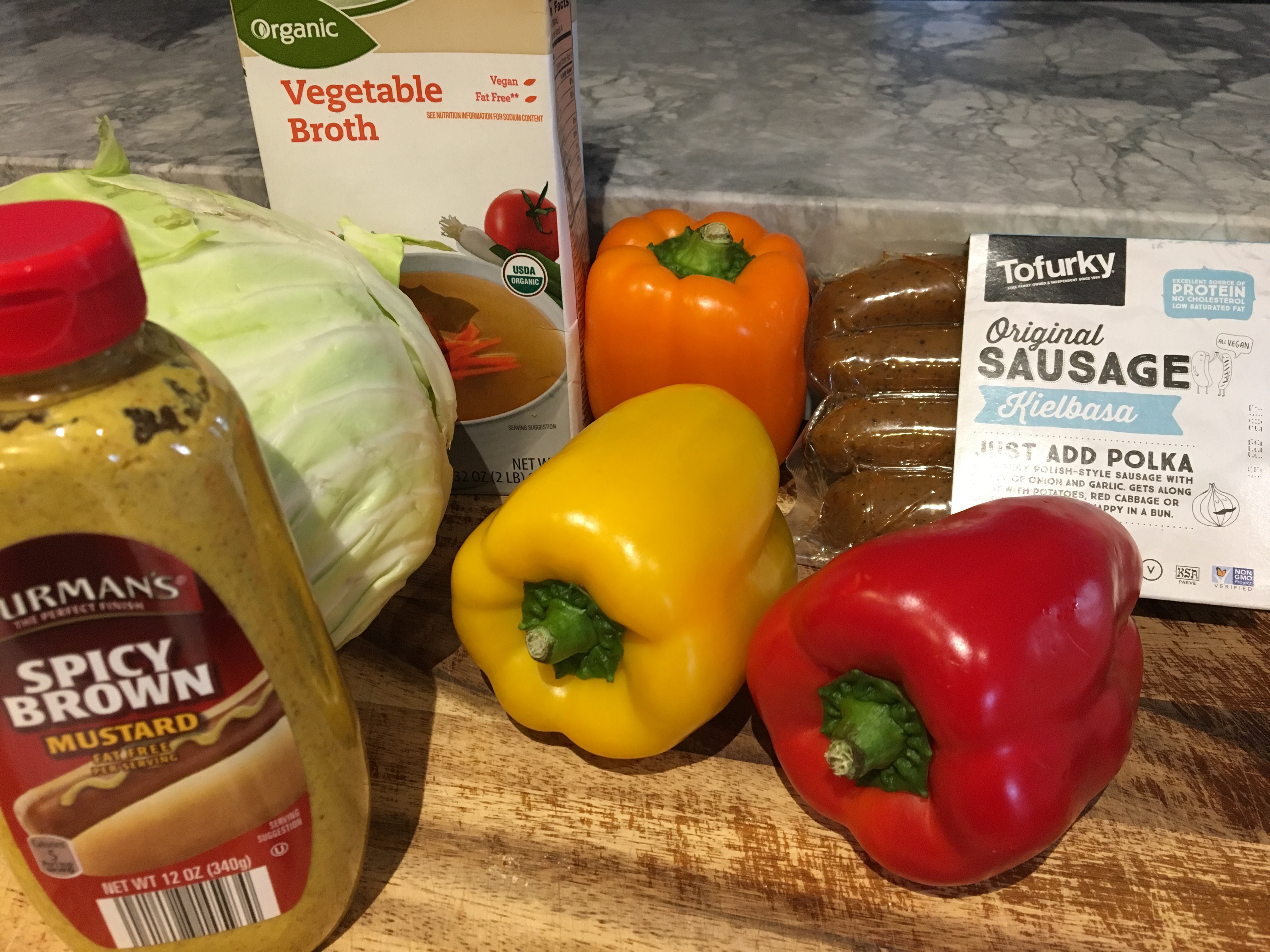 - 1 package of Tofurkey Kielbasa, chopped into 1″ chunks