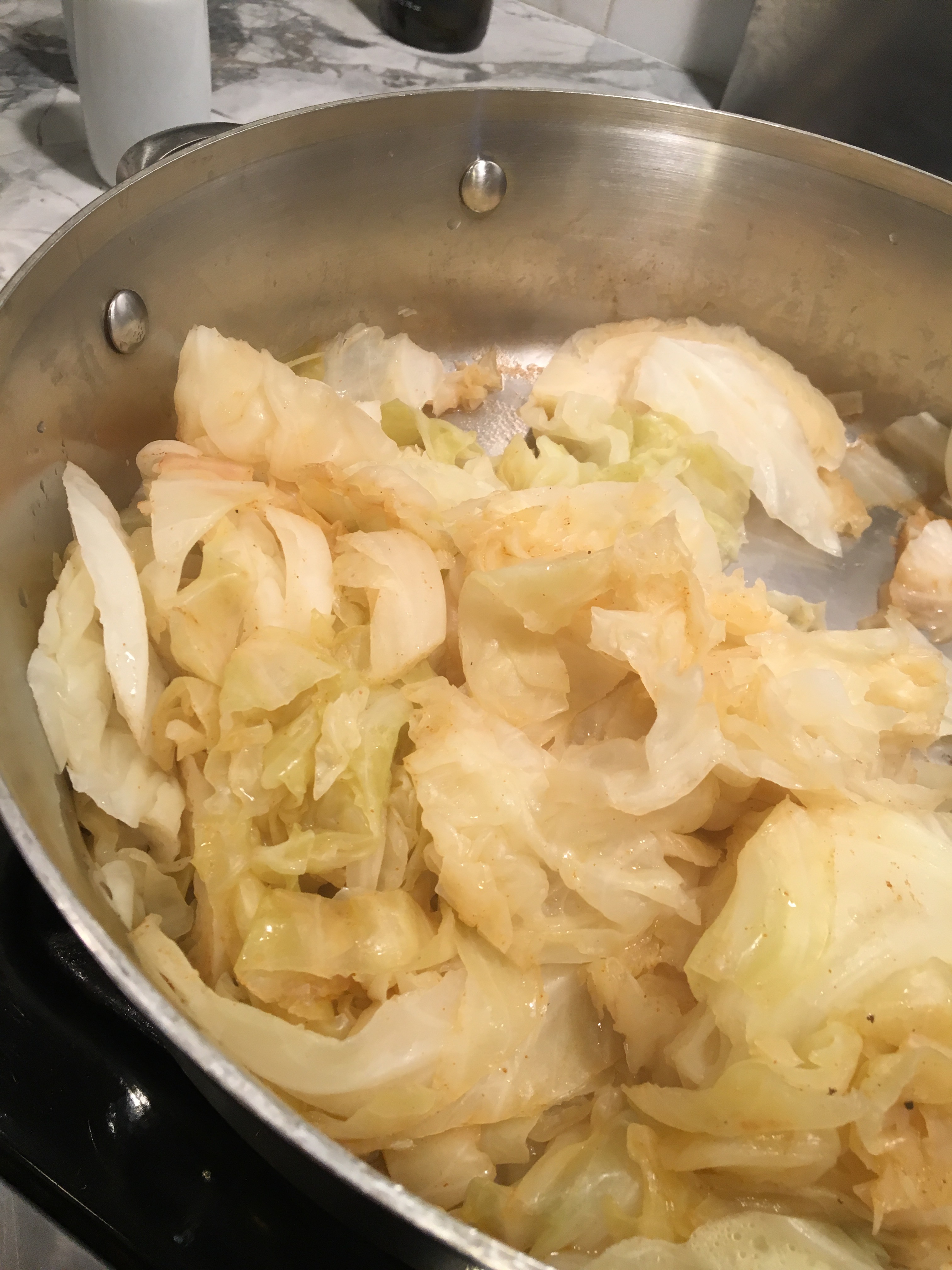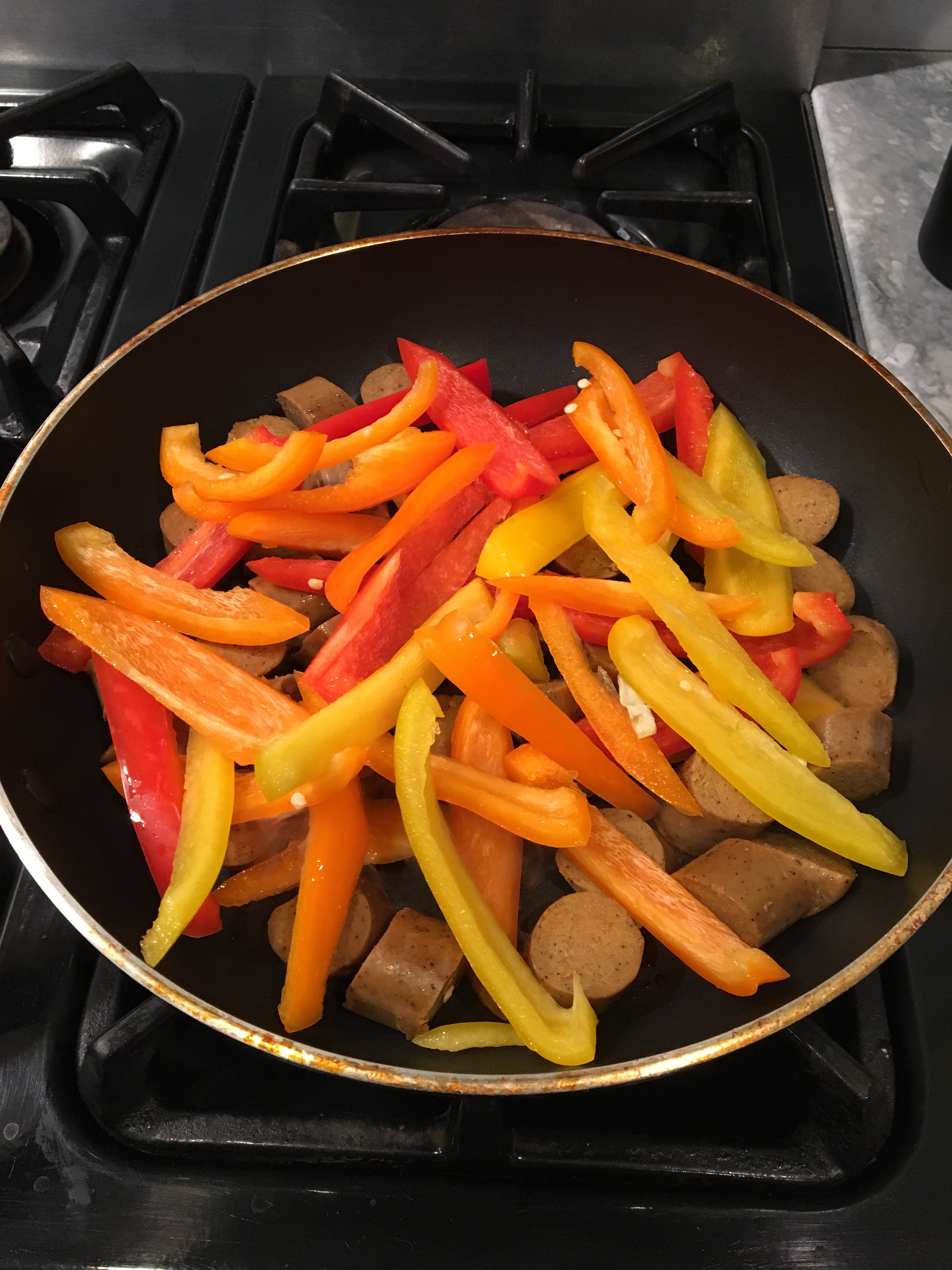 Add chunks of cabbage to a large sauté pan along with 1 cup vegetable broth and spices. Cover and let simmer for 30 minutes, turning every 5 minutes. I large frying pan add olive oil, peppers and sausages. Cook on medium heat for 10 minutes turning frequently. Once oil seems to dry out, let the peppers char very slightly in pan. Cook your choice of rice separately, then scoop cabbage and pepper/sausage mixture on top in a serving bowl. Top with spicy brown mustard or stone ground mustard and a small scoop sauerkraut.