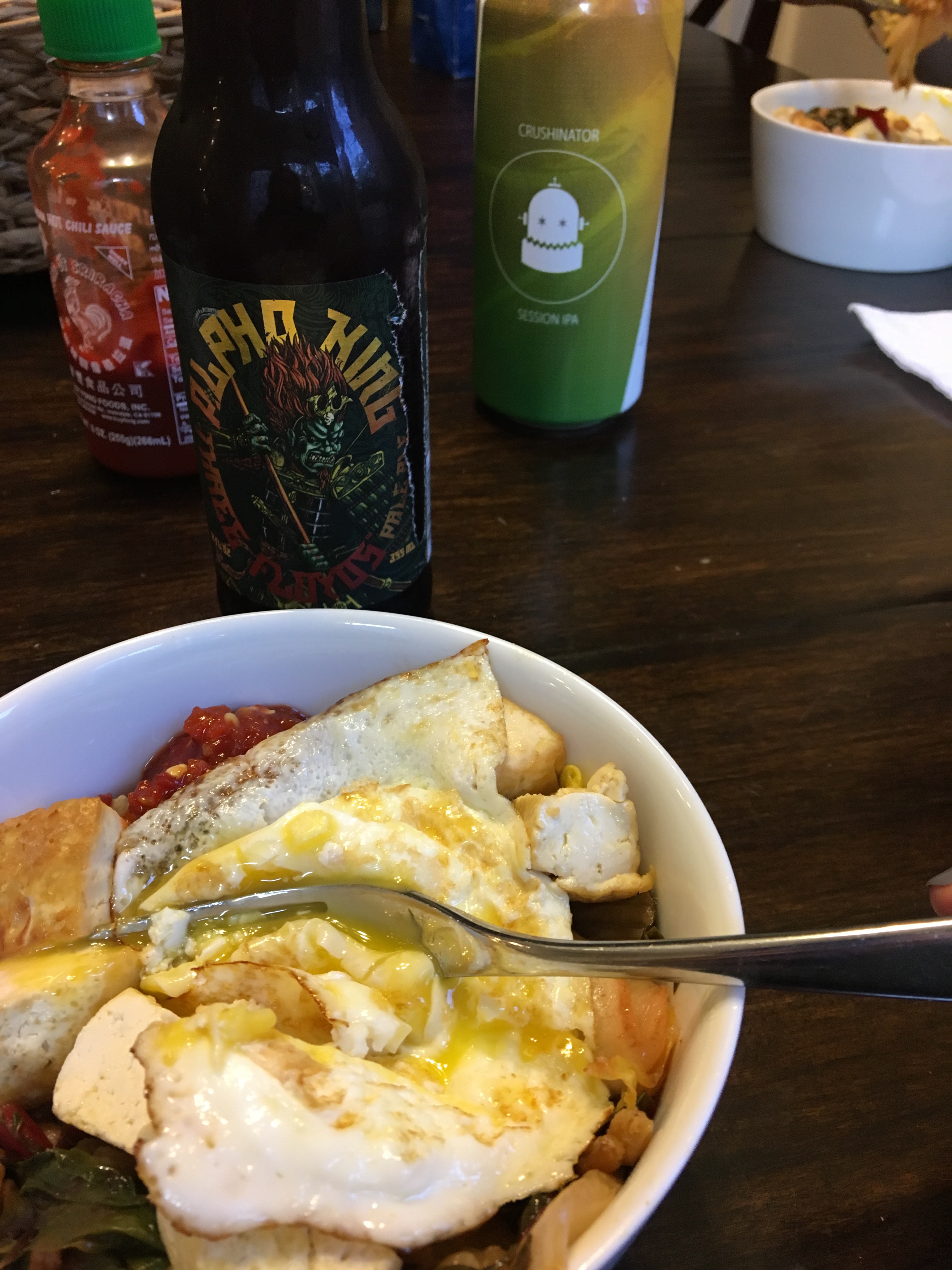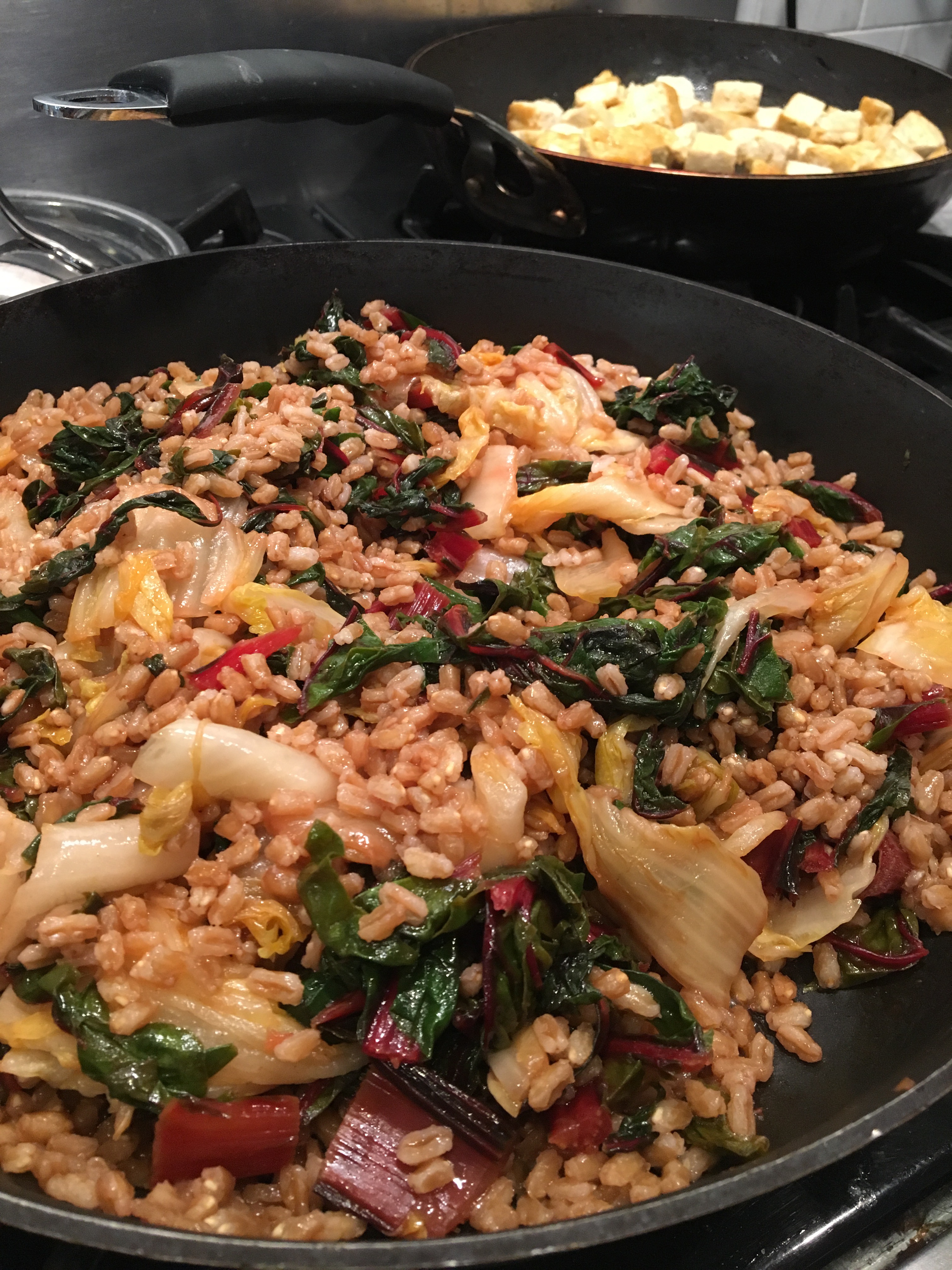 Simmer farro for 30 minutes. Heat 1 TB of sesame oil in a skillet over medium heat, then add a handful of chopped kimchi with its juice. Cook until kimchi is softened, about three minutes, then add one bunch chopped rainbow chard and 2 cups of cooked Farro, and a splash of water. Cook until greens are wilted and grains are warmed through. Stir in soy sauce, rice vinegar, and 1 TB sesame oil to taste. Top with a fried egg, yolk still creamy. We also added some fried tofu and sriracha, which is optional.