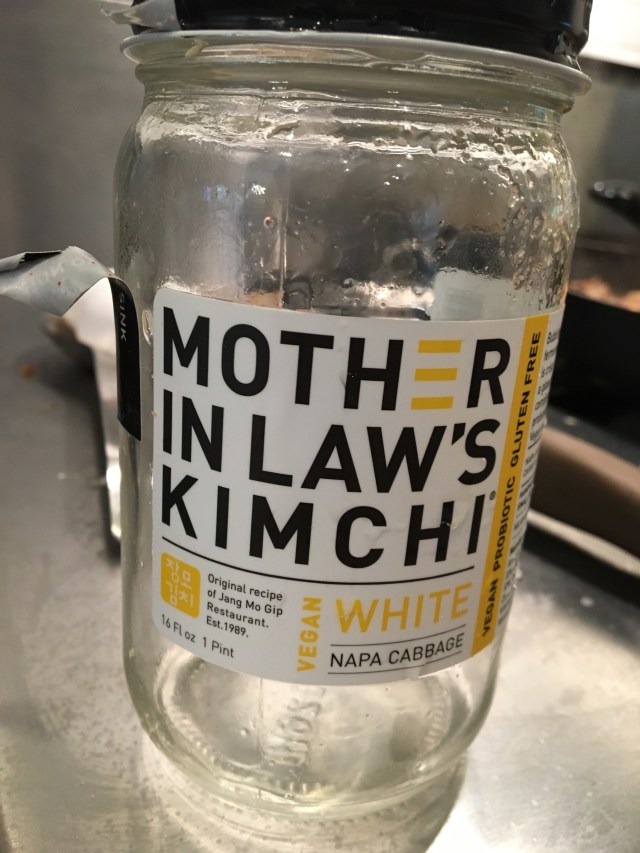 Farro is high in protein, fiber and B complex vitamins and is very low in gluten. It has a subtle nutty, chewy flavor and doesn’t release starch when it cooks, so the grains stay separated and marinate nicely with this sautéed crunchy rainbow chard and briney Kimchi base. The final step breaks a creamy egg yolk broken on top with a delicately fried egg – my husband’s speciality. Kimchi typically contains fish sauce but I discovered a vegan version at our local Fresh Farms market which was delicious and I highly recommend.