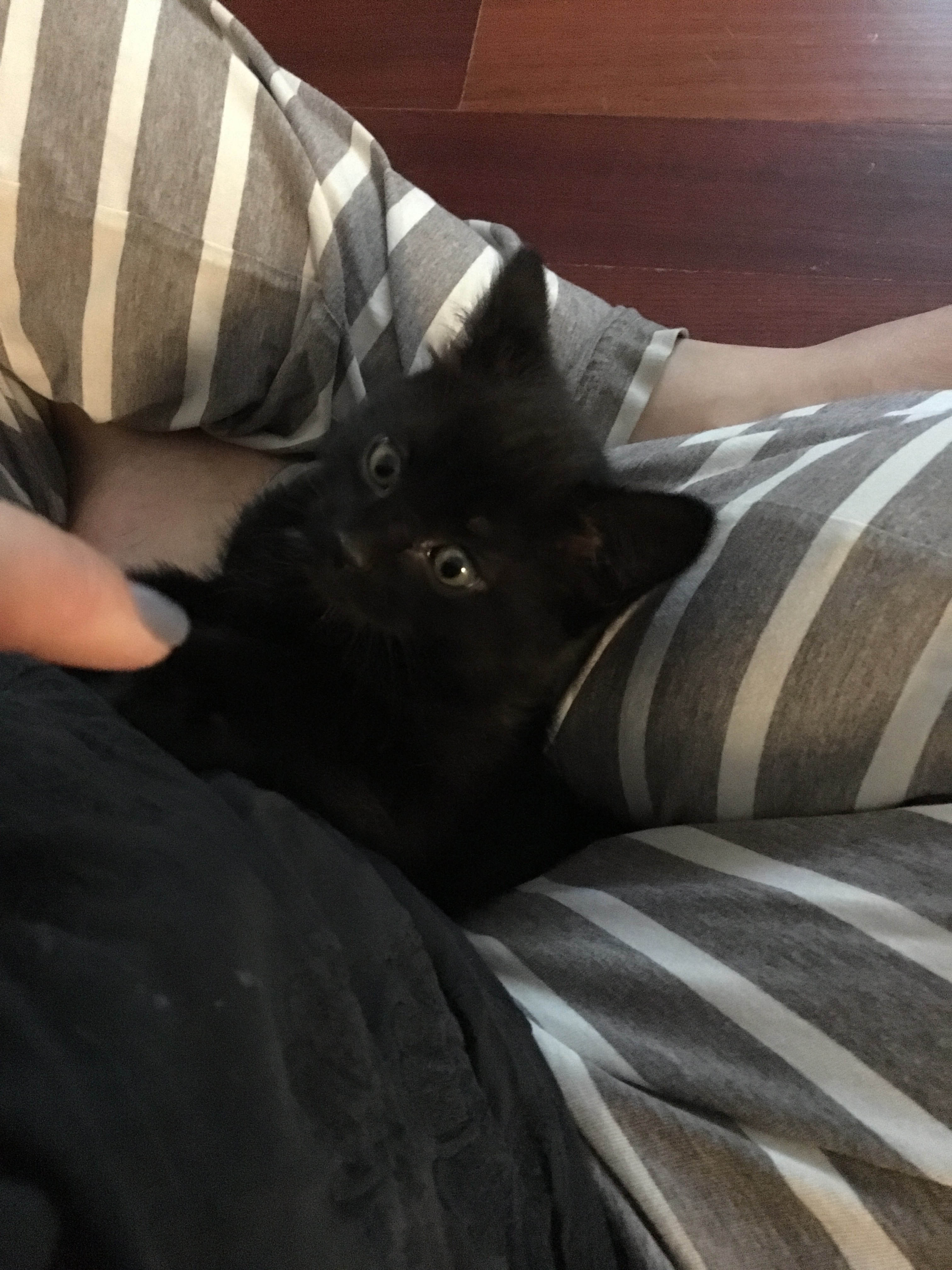 This Fathers Day brought my husband new summer sandals and an unplanned gift of a new kitten! The sandals came from Costco, and the kitten came from the window well leading down to our basement. The frightened kitten was discovered in the early hours of Sunday morning meowing in a highpitched, insistent frenzy. After the terrified 8-week old little guy was discovered and cleared by the vet … we soon learned he had lost track of his stray litter and knew in our hearts we had no choice but to welcome Stormy to the family! Mozy and Suki are not exactly pleased … yet…