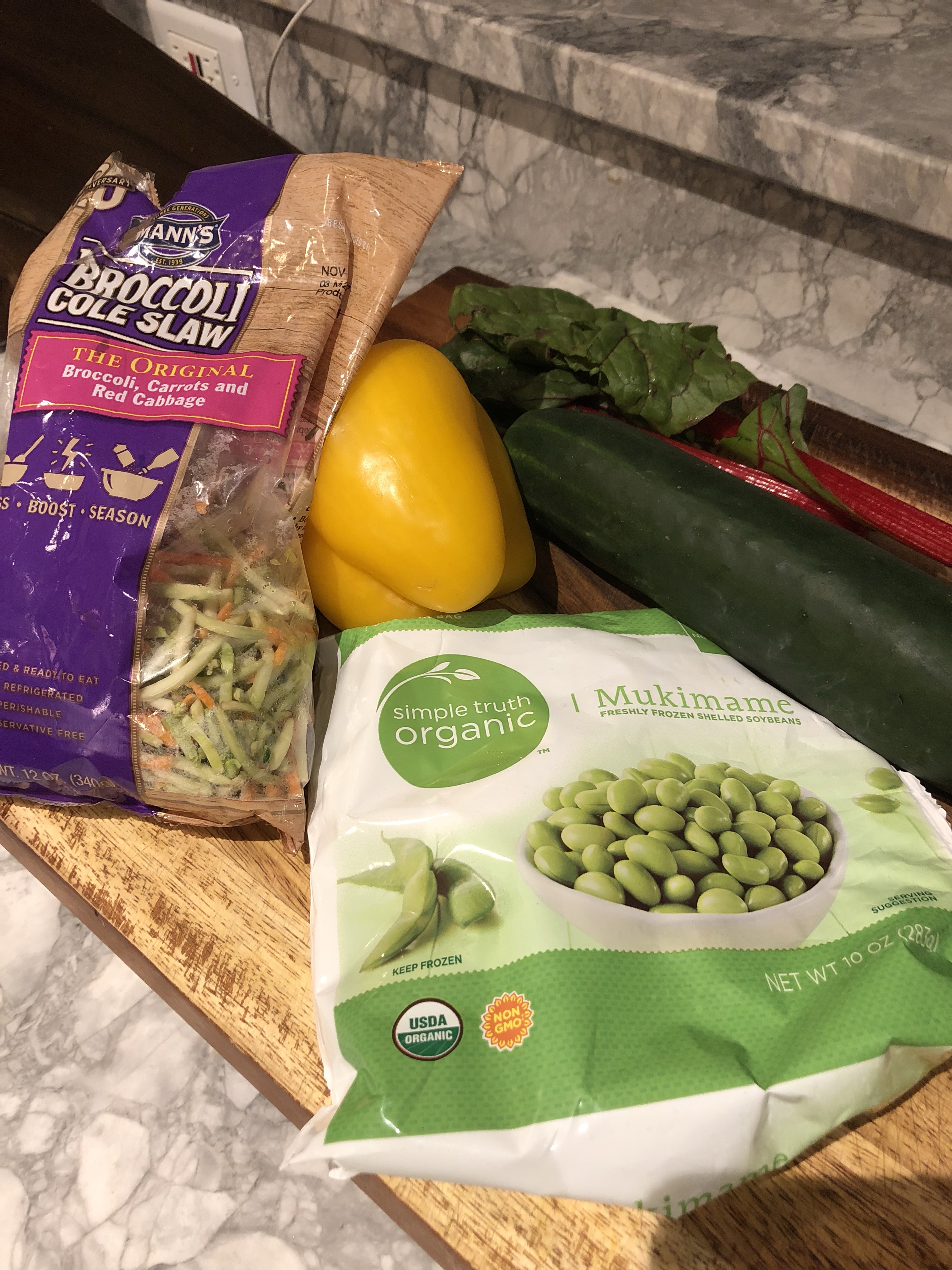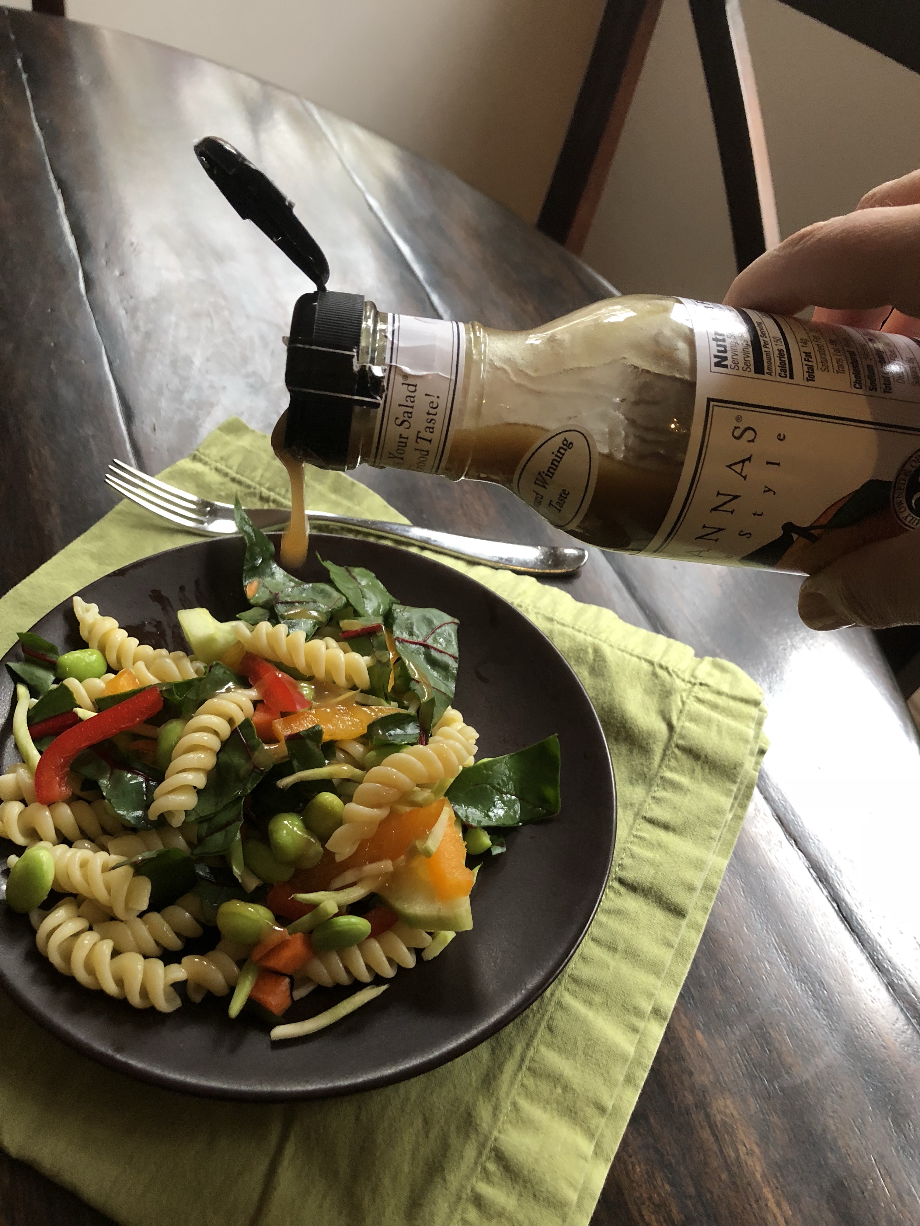 I love any salad that can be tossed with a cold cup of pasta for a hearty, fresh and easy meal either on-the-go or at home with kids. This Asian Swiss Chard salad recipe relies only on your basic knife skills and a quick assembly time, making it a versatile and vitamin-packed addition to your typical work lunch repertoire. The Brianna’s Home Style Ginger Mandarin dressing was on sale for $2.99 this week and is going to a fridge staple in our house as it packs a punch with its zingy creamy gingery flavor. This dish has potential for a great vegan Buddha bowl and can be combined with other key ingredients like avocado, sesame seeds, or nuts.