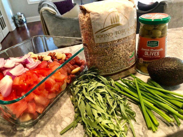 I guess my inner hippie got the best of me this week as I was really focused on Buddha bowls. Buddha bowls are essentially hearty grain-based dishes topped with an assortment of roasted or cooked vegetables and tossed with a vegetarian protein usually along with nuts or seeds. Their flavors can be soulful and complex, with unexpected items thrown together much like a garbage salad. They are really a vegans’ dream because they are filling entrees, rich in nutrient-dense foods, and they are easy to throw together and fun to eat! One my favorites to make at home is a barley bowl topped with sautéed kale, sauerkraut, tofu, sunflower seeds and avocado. Weird? No. But today I really wanted some red wine so I went for a Tuscan italian theme. I’d say this is comparable to a bruschetta bean salad mixed in with the nutty, chewy texture of Farro and tossed in a vibrant fresh herb vinegar dressing. It’s very versatile so you can also substitute other beans like chickpeas or white beans.