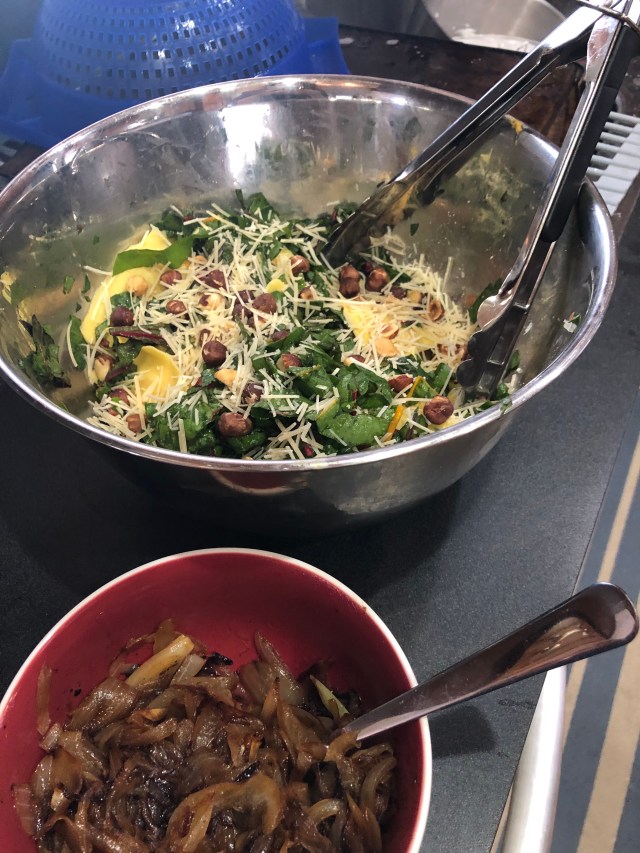 Prepare ravioli as directed, about 3 minutes in boiling water and cooled in colander then tossed gently with about a teaspoon of olive oil to prevent sticking. In pan, caramelize the onions over medium high heat with 1 TB olive in a pan, turning constantly for about 10 minutes and then cooled. Meanwhile, squeeze the lemon juice over the Swiss chard and top with salt, then massage the leaves gently for 2 minutes in a mixing bowl and set aside. When you are ready to serve, combine Swiss chard salad with ravioli on serving dish then top with crunchy hazelnuts and Parmesan cheese. My version was heavy on the Swiss chard and looked more like salad but next time I would serve on a long, flat dish to really make the ravioli shine.