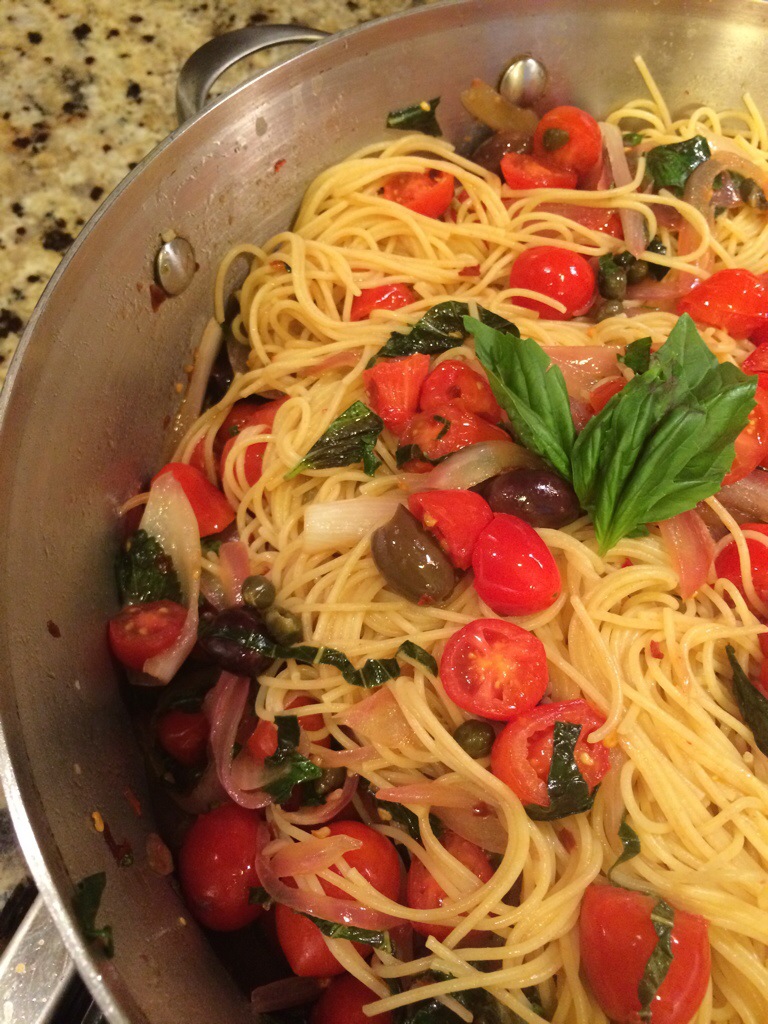 Boil pasta “al dente” according to package instructions, typically 10 minutes. While cooking, add a dollop of olive oil and cook onions and garlic on medium high heat for 5 minutes, stirring constantly. Add capers and cook additional 2-3 minutes. Finally, throw in tomatoes, olives and basil and cook 5 more minutes. Add about 1/8 cup olive oil to pasta then mix in puttanesca topping. Salt and pepper to taste.