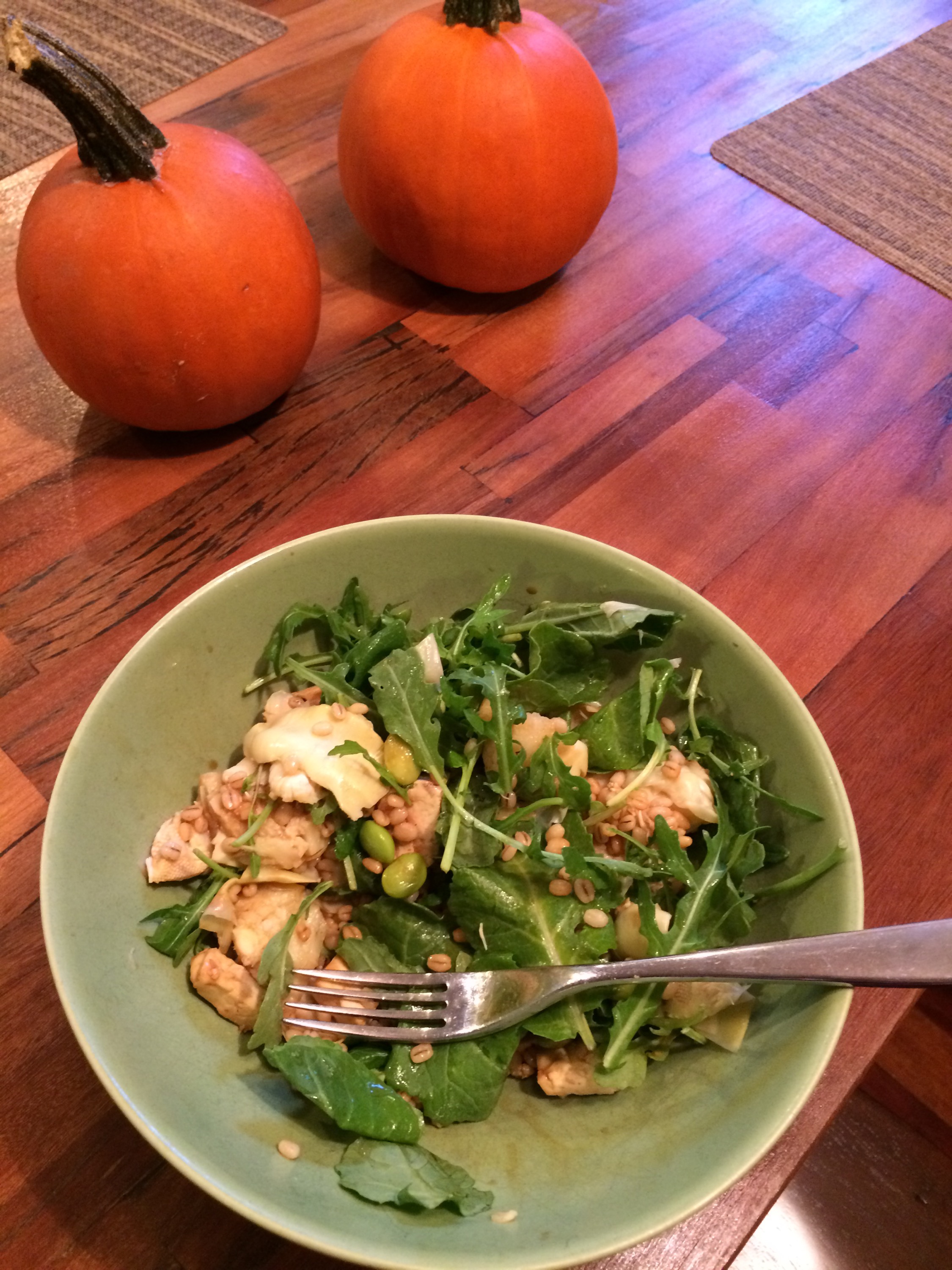 Anyway, with the recent fall weather quickly transitioning to snow, I was craving a hearty green and grain salad this week and stopped by Trader Joe’s to pick up a few of my favorites. Trader Joe’s has a nice variety of precooked, prepackaged items that really make a great dish when you’re in a pinch, either for one or served on a large platter for a holiday crowd. This time I used their Cruciferous Crunch Salad as a base with a selection of cooked beets, kalamata olives, Persian cucumbers, chickpeas, cherry tomatoes, farro and a giant bag of fresh haricot green beans which I blanched for 5 min but could also be eaten raw. Other variations I love from their refrigerated section include the precooked brown lentils and the fingerling potatoes. In place of farro you could also throw in some quinoa or rice. I topped it off with some lightly pan fried Lightlife bacon for more of a cobb salad flavor. I typically use balsamic vinegar for dressing, but tahini mixed with lemon juice is pretty amazing if you don’t want anything dairy-based. I also grabbed a little ginger lemon kambucha back tea for $2.99 – mwuah! Love it. So no real recipe today folks, just some tidbits on great plant-based food options in a one-stop shop that I enjoyed this week.