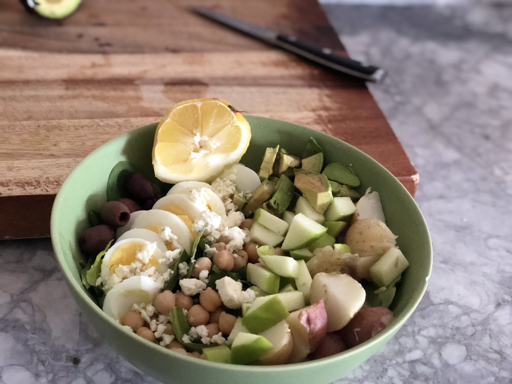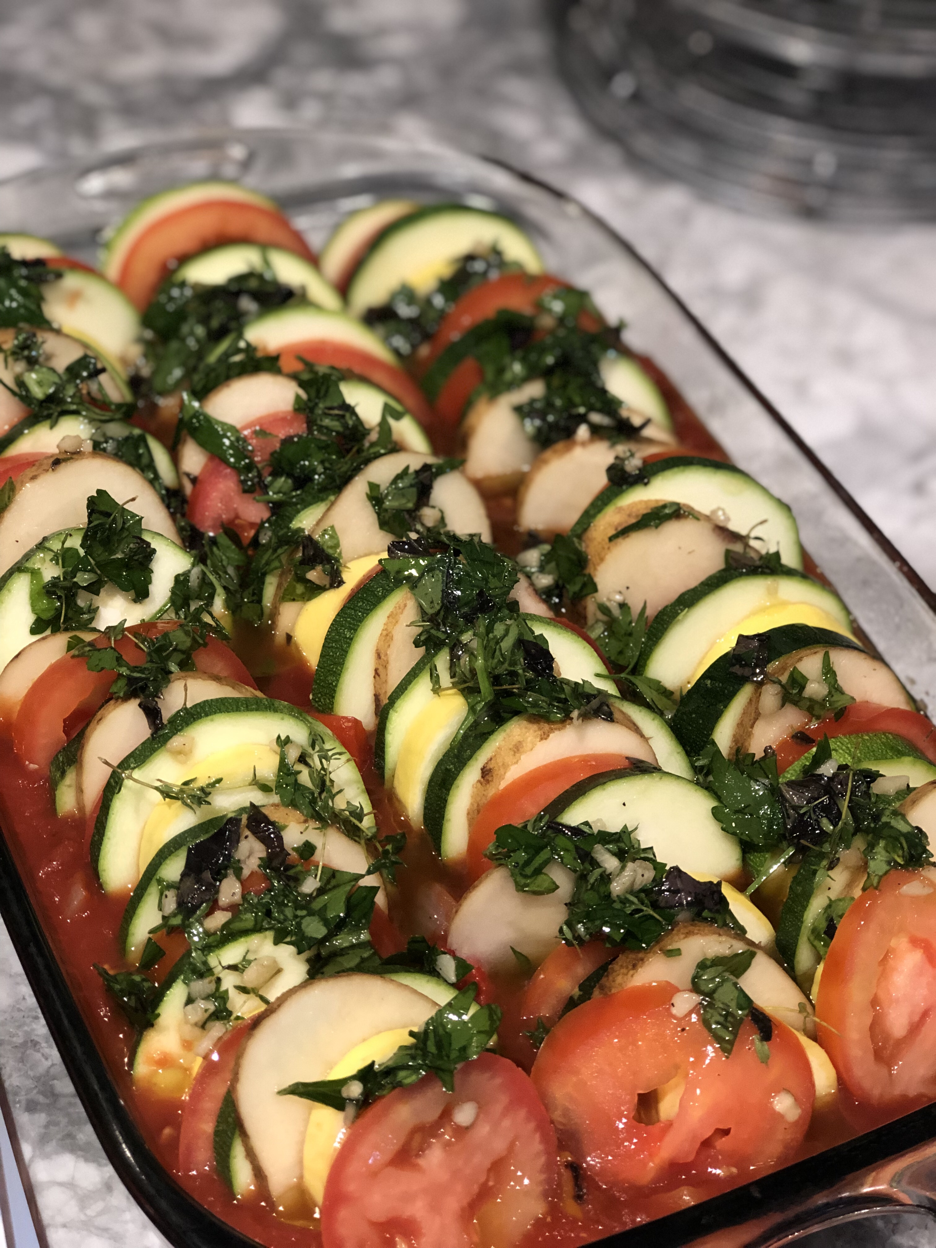 Cook Farro according to package and then let cool to room temperature. Chop vegetables into 1” cubes and toss to coat with olive oil, then grill on a sheet pan in oven at 400 degrees for 30 minutes, or grill over BBQ in large slices then chop smaller once fully cooked. Mix dressing ingredients in a small bowl and whisk to combine. Add warm vegetables, fresh peaches, chickpeas, and parsley to a large bowl with Farro, drizzle with dressing then toss well with to coat. Serve immediately, and salt to taste.